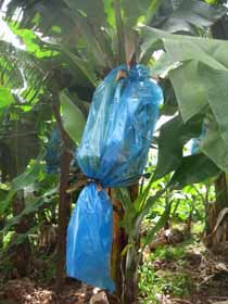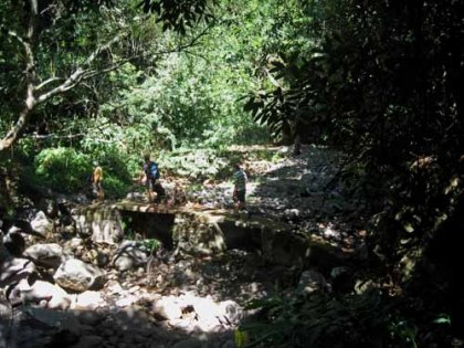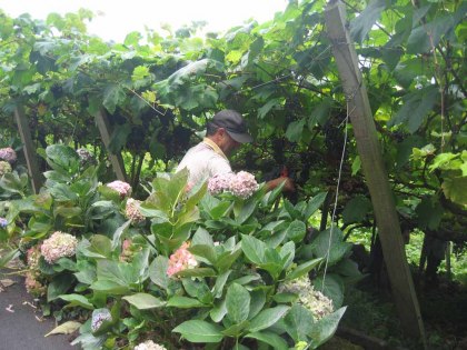 omdat we alles wilden proeven; sap van de suikerriet, Poca, Aguadientes en rum. De eerste twee zijn likeuren van Madeira. Ik vind het naar Obstler met en zonder jus d’ orange smaken. Bert vond het wel lekker, met alle gevolgen van dien. Na de bui zijn we heuvelop gegaan via een trap, langs woningen, bananenplantages en weer prachtige bloemen. Bij Bert zat de drank behoorlijk in de benen, maar na anderhalf uur de berg op en ook weer af, ging het alweer een stuk beter. Net bij dezelfde fabriek kwam er weer een gigantische bui. We zijn dus maar opnieuw de fabriek en proeverij in gegaan.