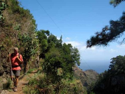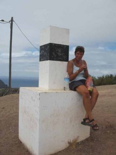Het wandelt heerlijk, prachtige uitzichten, de zon, niet te warm en heel rustig. We komen 6 mensen tegen. Precies volgens de tijd uit ons boekje komen we bij het eind. We lopen terug naar Assomada waar onze auto staat. Bij de bakkerij verwennen we ons met een heerlijk taartje en een cola. Blijkbaar ben ik geen rugzak gewend en sla met deze rugzak mijn fles cola van de tafel. Bij het oprapen raak ik een scherf die Bert in zijn handen heeft en heb dus twee bloedende vingers. Het kan geen toeval zijn dat we vandaag voor het eerst een EHBO kit mee hebben, en die kan dus meteen uit de rugzak. We oefenen nog meteen onze EHBO regels, maar constateren dat er verder geen gevaar is en dat we het slachtoffer zelf kunnen helpen. Klein foutje, er zit geen schaar in de kit, dus die lenen we van de bakker. Met 2 pleisters stap ik weer in de auto. We willen nog even internetten en komen aan de boulevard van Machico (met gratis Wifi) uit. Voor het eerst eten we weer echt lekkere patatten bij een soort Mc Donalds. We skypen, lezen de nodige mails uit en kijken op de site van de andere vertrekkers waar ze nu zijn (altijd weer erg leuk). Helaas is de verbinding te slecht om onze eigen site bij te werken. In de avond drinken we nog thee bij Poll en Kyra van de Yara en gaan op tijd naar bed.