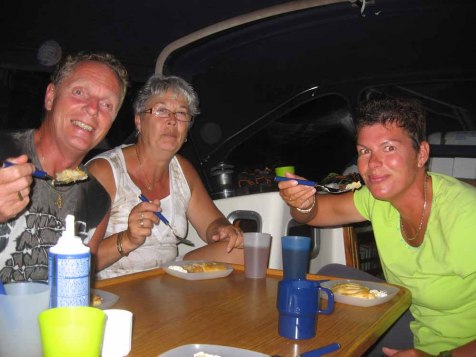 Na 5 minuten onze fietsremmen gemarteld te hebben staan we weer beneden. Het zweet spoelen we op de steiger af met de gewone waterslang. Dan doen we nog snel wat voorbereidingen voor site en gaan we weg voor onze internetdate met Poll en Kyra van de Yara. Dit loopt natuurlijk weer uit zodat we in het donker nog met Ria en Otto zitten te skypen en zonder licht op onze fiets terug naar de haven rijden. Donders wat een drukte! Bert heeft bijna de hongerklop. Aan boord moet hij nog informatie van onze Belgische buurman Luc doornemen en moeten we nog eten. Als Bert na het eten nog steeds ietwat dizzy is, is mijn vraag “je bent toch niet overspannen van al die drukte”? En dan te denken dat we vroeger dachten dat vertrekken niets voor ons is, omdat we toch wel graag “onder de mensen zijn”. Nou hier hebben we vandaag geen gebrek aan gezellig met al deze mensen om ons heen. Lars en Aukje van de Laaxum komen nog even borreltje drinken en voor we er erg in hebben zit Annette haar normale nachtwacht tot van 02.00 uur tot 06.00 uur er in ieder geval weer voor de helft op. Leuk detail is dat Lars zijn vader de ontwerper en bouwer was van de skarl de eerste open boot die wij in Friesland huurden aan het begin van ons zeilerbestaan “It’s a small world”.