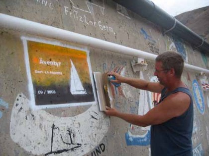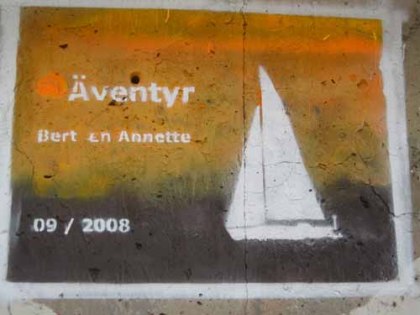 Vandaag stond in het teken van visitekaartjes. We wisten dat sommige zeilers een visitekaartje hebben, maar waren daar ten eerste niet meer aan toe gekomen en vonden het ook wat overdreven. Maar we ontmoeten zoveel andere vertrekkers en iedere keer verdwijnen uitgewisselde gegevens op losse briefjes, terwijl we de kaartjes netjes bewaren. Dus gisterenavond heeft Bert driftig zitten ontwerpen op de laptop. Vanmorgen terwijl ik bij de kapper zat (die kort en een beetje rommelig wel heel letterlijk heeft opgevat) stond Bert 3 deuren verder bij een fotoshop in zijn beste Portugees uit te leggen wat hij wilde. En na drie keer van de haven naar het dorp gefietst te zijn, liggen er nu 80 glimmende kaartjes met dezelfde lay-out als de website in de kaartentafel. Helaas kreeg ik tijdens de 3e fietstocht (de 2 keer daarvoor waren ze niet klaar) een lekke band. Nu had ik volgens ons buurmeisje Silke van 4 jaar, wel kleine pepernootjes op mijn brood gehad (speculaasbolletjes), maar ik had volgens mij geen pepernootje in mijn band. Wel moest ik mooi een half uur lopen met de fiets aan de hand. Bert was inmiddels met de volgende artistieke uitspatting bezig. Op de kademuur in de haven staan allemaal tekeningen van zeilers (het meest bekend is de muur op Horta op de Azoren) en Bert wilde ook hier “ons visitekaartje” achter laten. Dus heeft hij een mal gemaakt en vier spuitbussen lak gekocht. Na een uur spuiten en verven staat er nu ook een herinnering aan ons op de muur. En ook hier zoals op de website.