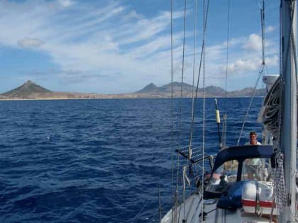 We gaan de prettige haven van Porto Santo weer verlaten. Een haven met een bijzondere vertrekkers-sfeer. Niet groot, veel jachten aan een mooring (niet iedereen heeft zoals wij last van “havenplak”) en iedereen die je spreekt is toch wel blij en trots dat ze hier met hun eigen boot liggen. Porto Santo is weg van de drukte, ondergedoken voor de werkelijkheid en altijd zon. We hebben gistenen onze bootpapieren weer teruggekregen (voor het eerst moesten we die afgeven) en ons netjes afgemeld bij de Brigada Fiscal. Er heeft 5 dagen wind uit het zuidwesten gestaan en nu deze gedraaid is, heeft dit een ware uittocht tot gevolg. We zien tot en met Madeira steeds bootjes voor en achter ons. Iedereen vaart op een gennaker of spinnaker. Al die kleuren zien er vrolijk uit. Wij starten nog even alleen op de Genua, want Bert heeft nog geen tijd (???) om de gennaker op te zetten. Het zit namelijk zo: de prioriteiten zijn wat verschoven, het visequipment moet eerst in orde zijn.