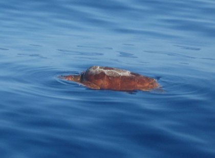 Eind van de middag hebben we weer ons doucheritueel en daarna zetten we de SSB aan. Compleet verbaasd zijn we als we Dennis horen. Die moest weer aan het werk zijn, maar blijkt als een gek naar de radiovereniging gereden te zijn om met ons contact hebben. Is dit niet super. Het contact is kraakhelder en meer dan een uur zitten we te kletsen, terwijl in de verte een paar dolfijnen een springshow opvoeren. Dennis biedt aan onze ouders even te contacten, die dit geweldig vinden. We geven onze positie, koers en snelheid door. Helaas zorgt de motor nu voor de meeste voortstuwing. Even later zien we iets drijven. Het lijkt wel een boei. “Nee, kijk nou het is een zeeschildpad”. Snel draaien we de fok in en proberen in de buurt te komen. Kicken!! Na twee foto’s zien we zijn pootjes bewegen (zwaait hij?), de kop komt omhoog. Oh wat is dit gaaf! Hij lijkt te denken, wat doen die herriemakers hier nu en duikt onder. Iets later zien we de 2e, maar die verdwijnt ook meteen en de 3e besluiten we maar met rust te laten. De dag vliegt zo om en we draaien onze wachten weer. De deining is veel minder, het is superhelder. Soms zie ik lichtjes die de radar nog niet ziet. Vannacht “doe ik het met Herman Finkers, Hans Teeuwen en zelfs Snip en Snap”. Er gaan weer 2 schepen ruim om ons heen. We schommelen minder en ik slaap zelfs het grootste deel.