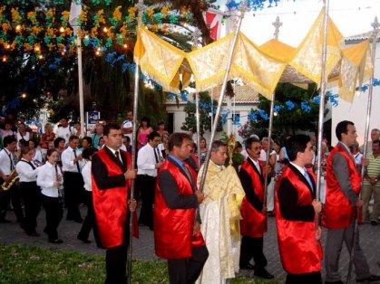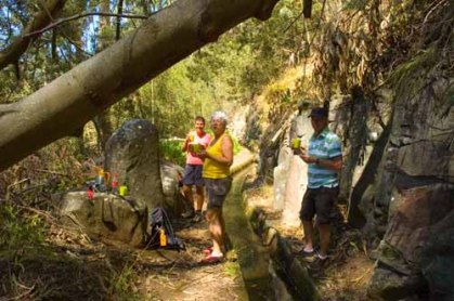 Vandaag is het Ciderfeest in Santo da Serra. Volgens onze havenmeester (een zeer vriendelijke dame) met folklore, muziek en tradities. Wij halen Ria en Otto op en rijden naar dit plaatsje via een steile weg. Nu had ik mijn wandelboekje ook nog een leuke wandeling gezien en dacht we maken een combi. Uurtje of twee wandelen en daarna het feestgedruis in. Nogal onvoorbereid sleuren we Ria en Otto in ons wandelavontuur. We lopen eerst verkeerd omdat er een nieuwe weg is aangelegd, die er tijdens de uitgifte van ons boekje nog niet was (de 1e rechts, was nu de 2e rechts geworden). Na meer dan een half uur over de nieuwe rondweg gelopen te hebben komen we weer bij dezelfde kerk uit als waar we begonnen waren. We gaan voor de 2e ronde. Het eerste stuk is asfalt en beton en daalt heel sterk. Oeh de kuiten, bovenbenen en knieën . Ook hier weer 2 nieuwe wegen. Na wat gezoek en gemopper bereiken we de Levada. In mijn boekje staat dat zelfs de meest verwende Levada wandelaar hierdoor verrast zal zijn. Het eerste deel is wat saai, maar de thee en taart onderweg maken het “draaglijk”. Al snel blijkt ons boekje (nog) de waarheid te spreekt. Helaas zijn al veel bloemen uitgebloeid, maar vele kleuren groen, veel wilde fuchiabomen, wilde aardbeien, watervallen, passiebloemen, oleanders maken het zeer de moeite waard.