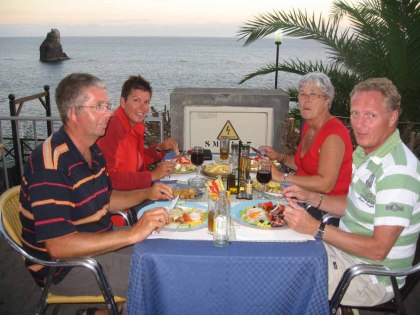 Ik ben tot de helft gekomen. Geen wonder dat de obers het hier razend druk hebben. Halverwege de avond lijkt het wel of je naar een versneld afgespeelde film zit te kijken, zo hard lopen ze. Met enige moeite lukt het ook nog om een rekening te krijgen. Ria en Otto blijven in Funchal en wij rijden terug naar onze haven (ongeveer 35 minuten). Alleen we vinden autorijden allebei zo hard gaan. We rijden 80/90 en hebben het gevoel of we scheuren. De weg is wel tamelijk bochtig en we worden niet aan alle kanten ingehaald, dus zo suffig zullen we niet rijden, maar we zijn gewoon de snelheid ontwend. Funchal is overigens ook veel groter en drukker dan we verwacht hadden. Ook hier vragen we ons af, hoe deze prachtige wegen en onvoorstelbaar aantal tunnels zijn gefinancierd.