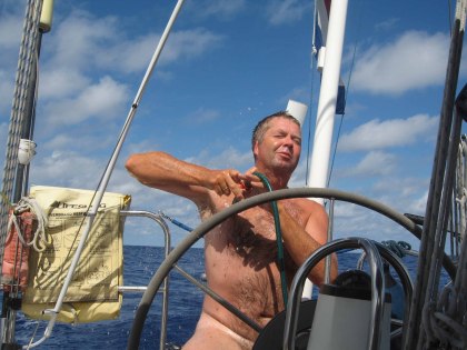 Er komt een schip aan, en deze is wel heel groot. “ Ship in position 36o27’ north and 011 o 02’ west, this is sailing yacht Äventyr, do you read me” roept Bert op kanaal 16 van de marifoon. Na 2 pogingen hebben we contact. “Do you see me on radar and what are you intentions”, gaat Bert verder. Of course, zag hij ons op zijn radar en hij gaat achter ons langs, reageert hij. We geloven er geen snars van en volgens ons zat hij te pitten, maar goed na dit contact draait hij, ons met een rustiger gevoel achter latend. De zon schijnt vandaag uitbundig en aan het eind van de middag douchen we achter in de kuip met onze gardenaslang aan de keukenkraan. Zo fris als een hoentje zeilen we de 2e nacht in. Weer trekt de wind aan, het wordt tijdens de wacht van Bert zelfs regenachtig en het 2e rif gaat er midden in de nacht in (leermoment: als de grote Genua op staat, gaan we met een 2e rif de nacht in, dit geeft de meeste rust en scheelt qua snelheid weinig). Als ik de wacht overneem, schommelen we behoorlijk van de deining. Van slapen was weer niets gekomen en buiten wordt ik misselijk. Gatver. Dit wil ik niet. Moe en ziek zit ik te mokken. Bert vraag of ik het 2 uur wil proberen vol te houden, zodat hij toch even kan slapen. “Reddingsmiddelen” ; bananen en zeeziektepillen worden gepakt. Ik schrok alles naar binnen. Gelukkig zakt het en haalt Harrie Jekkers me toch door mijn wacht heen. Met grote dank aan vriend Marco die veel cabaret op mp3 voor ons heeft verzorgd.