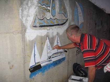 De drie boten, waar we nu al een aantal weken mee samen varen achter elkaar. Dit zijn de Vida, wij en de Chica. Er moet alleen nog wat muurverf bijgekocht worden. Samen pakken we de fiets en lopen een aantal winkels af voordat we verf en kwasten hebben. Bert bemoeit zich nog met de artistieke uitvoering en zo ontstaat er een fraai schilderwerk ter herinnering aan ons op de muur.